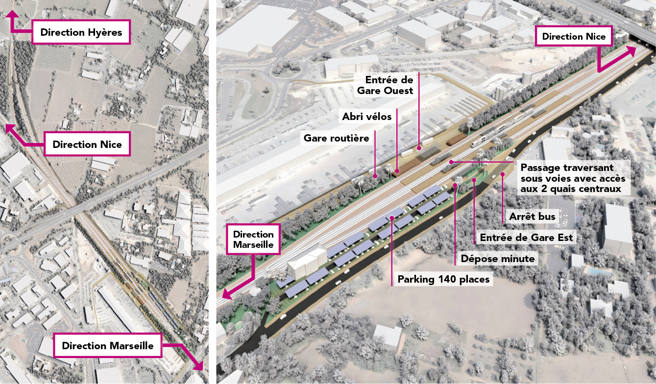 À La Pauline, la gare existante est transformée pour devenir multimodale et « traversante » afin de desservir directement la zone d’activités de l’est toulonnais et le pôle universitaire de la Garde. Des trottoirs confortables et des pistes cyclables sont prévus sur sa face ouest où se développera également une véritable gare routière connectée au futur réseau bus en site propre. Le parking voitures et la dépose minute resteront à l’Est.