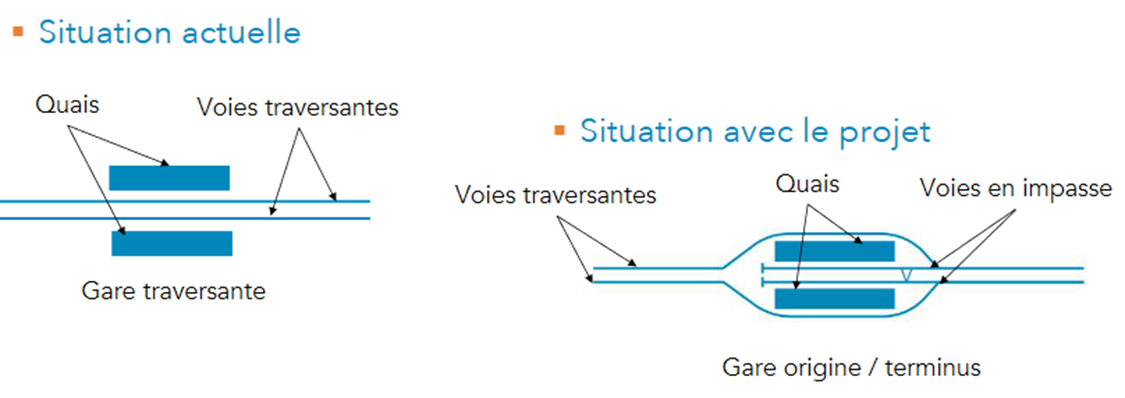 De manière à permettre le retournement des trains de la navette toulonnaise, 2 voies centrales en impasse et 2 quais centraux de 220 m seront créés, en plus des 2 voies latérales existantes.