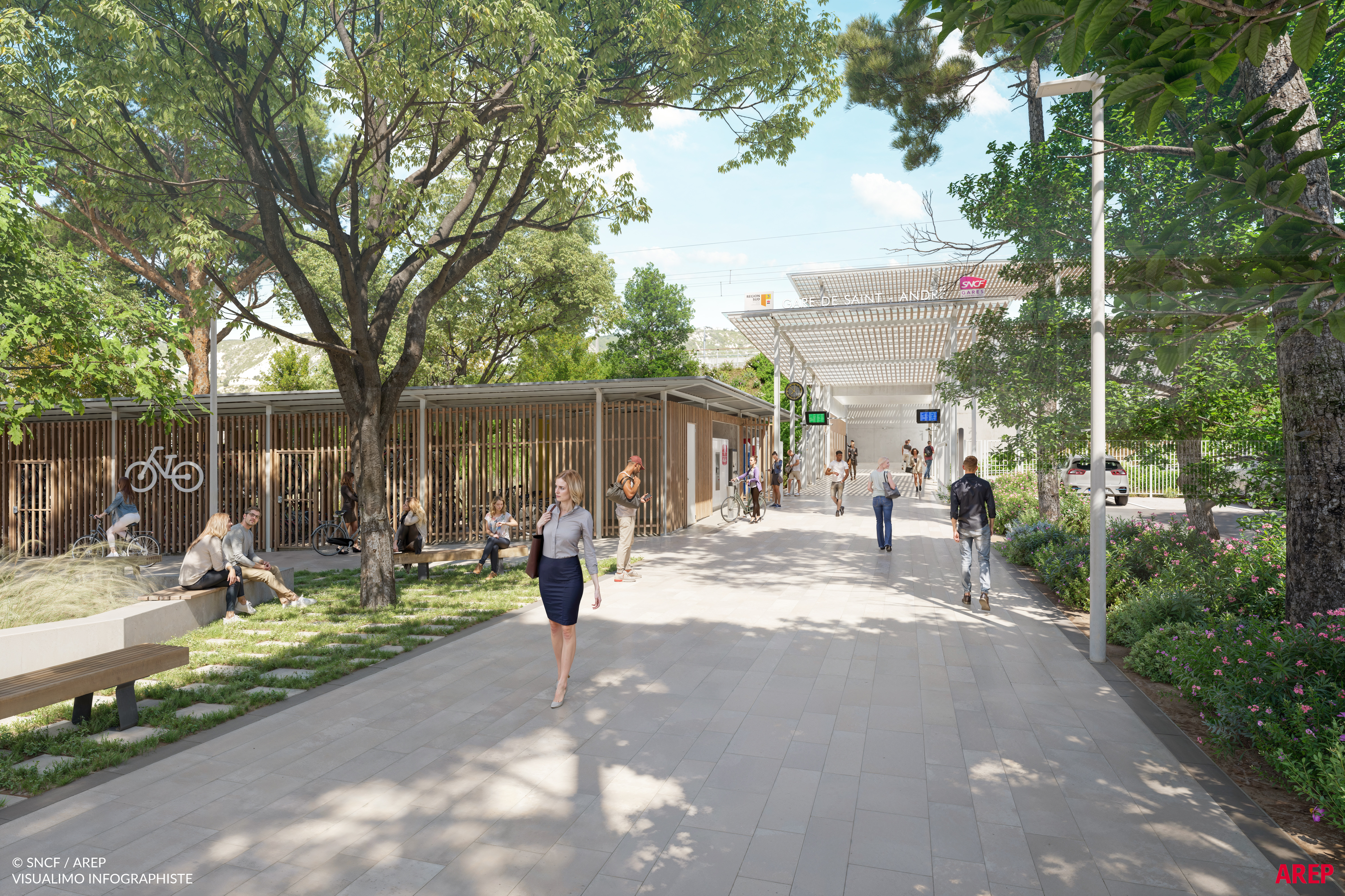La future halte Saint-André a été pensée pour s’intégrer harmonieusement à son environnement. Elle sera éco-conçue, avec un aménagement des espaces extérieurs et de la halte limitant les effets d’ilots de chaleur et une gestion paysagère des eaux pluviales.